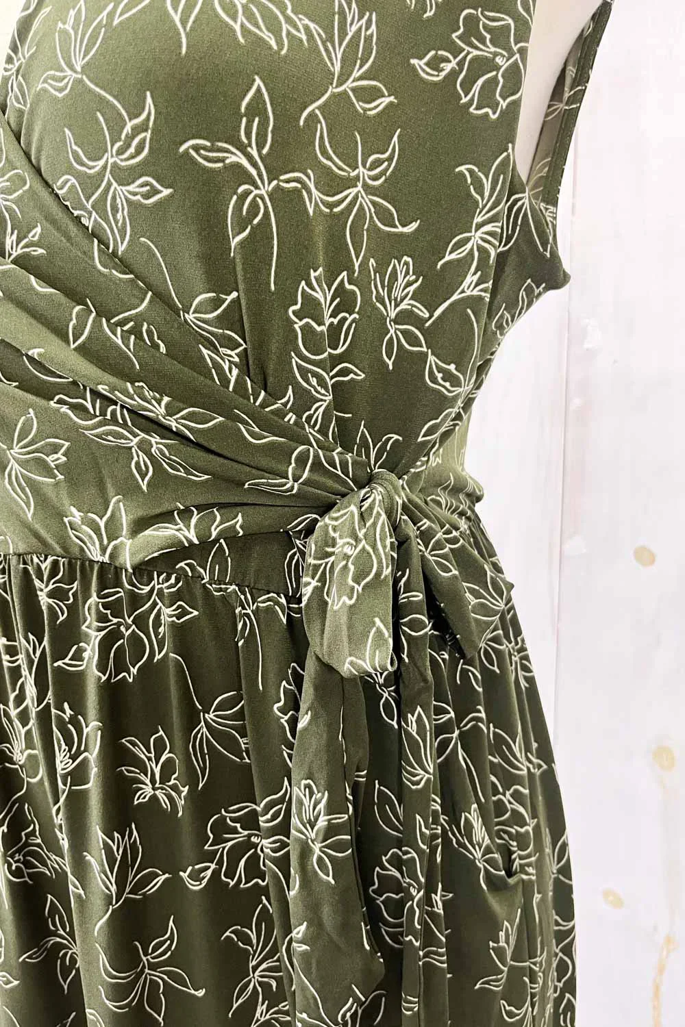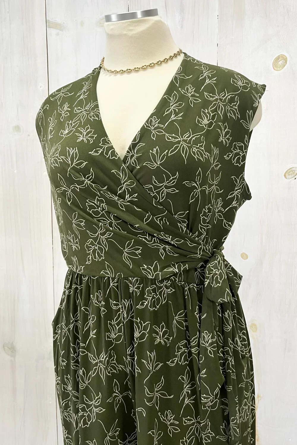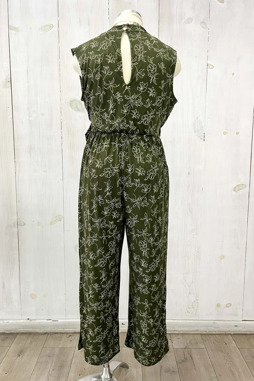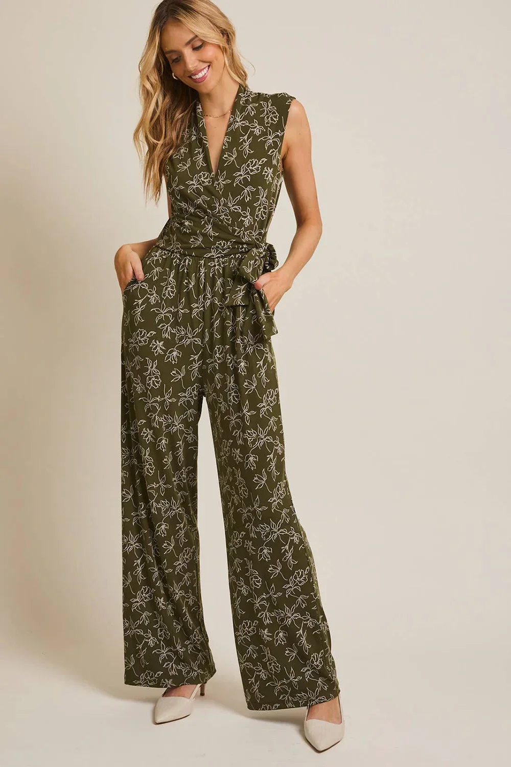 Olive Green Floral Print Front Wrap Sleeveless Wide Leg Boutique Jumpsuit