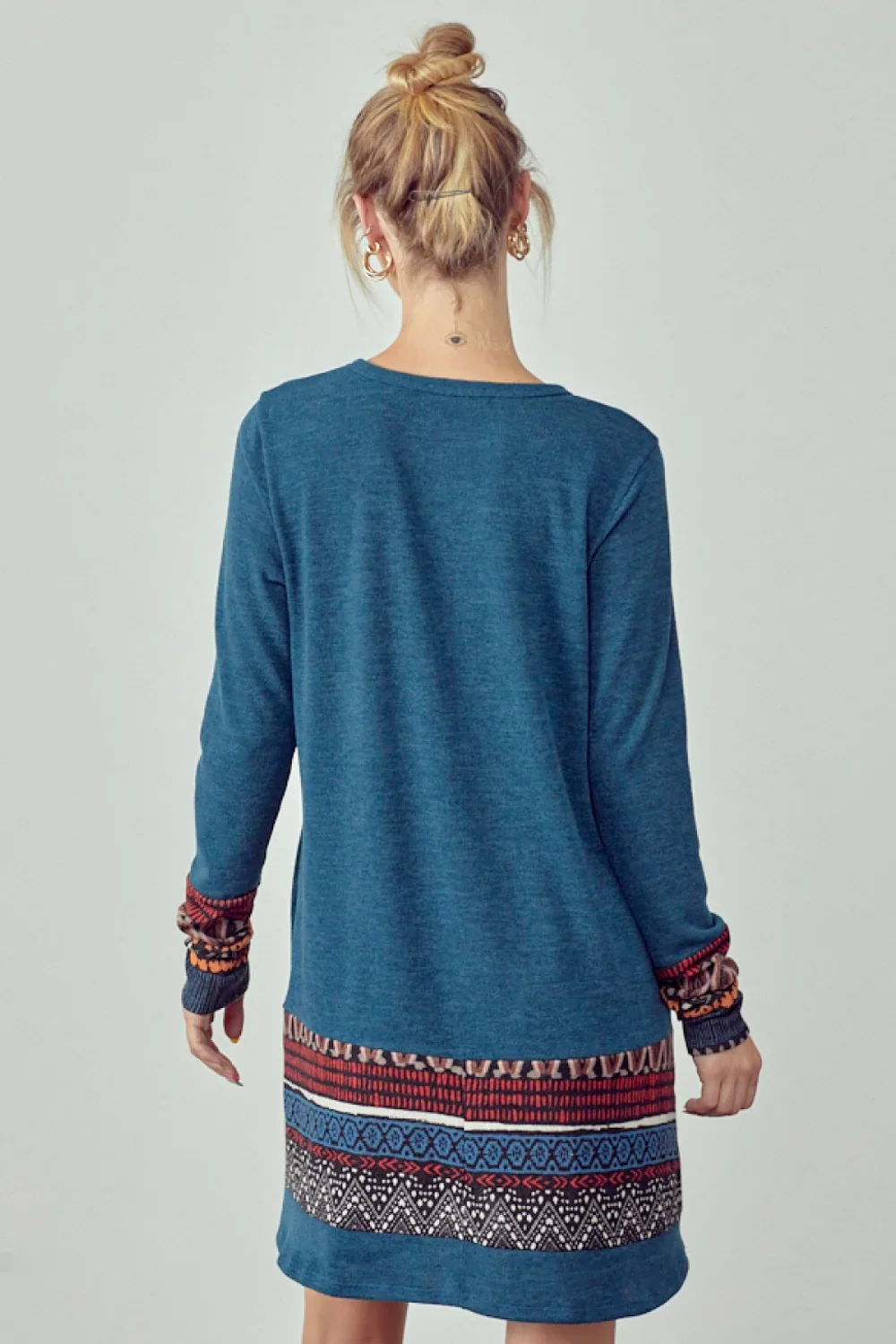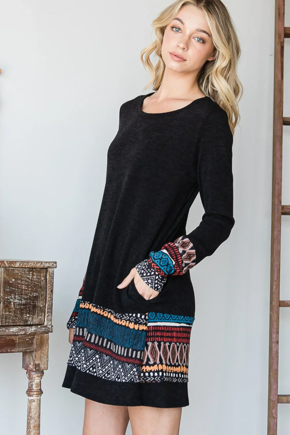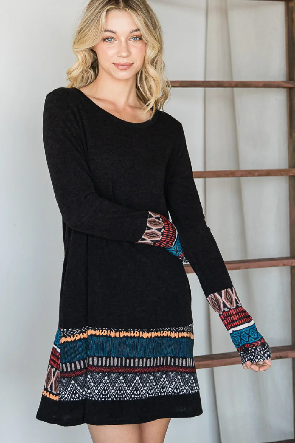 Plus Size Long Sleeve Ethnic Print Trim Casual Boho Shift Fall Winter Boutique Dress