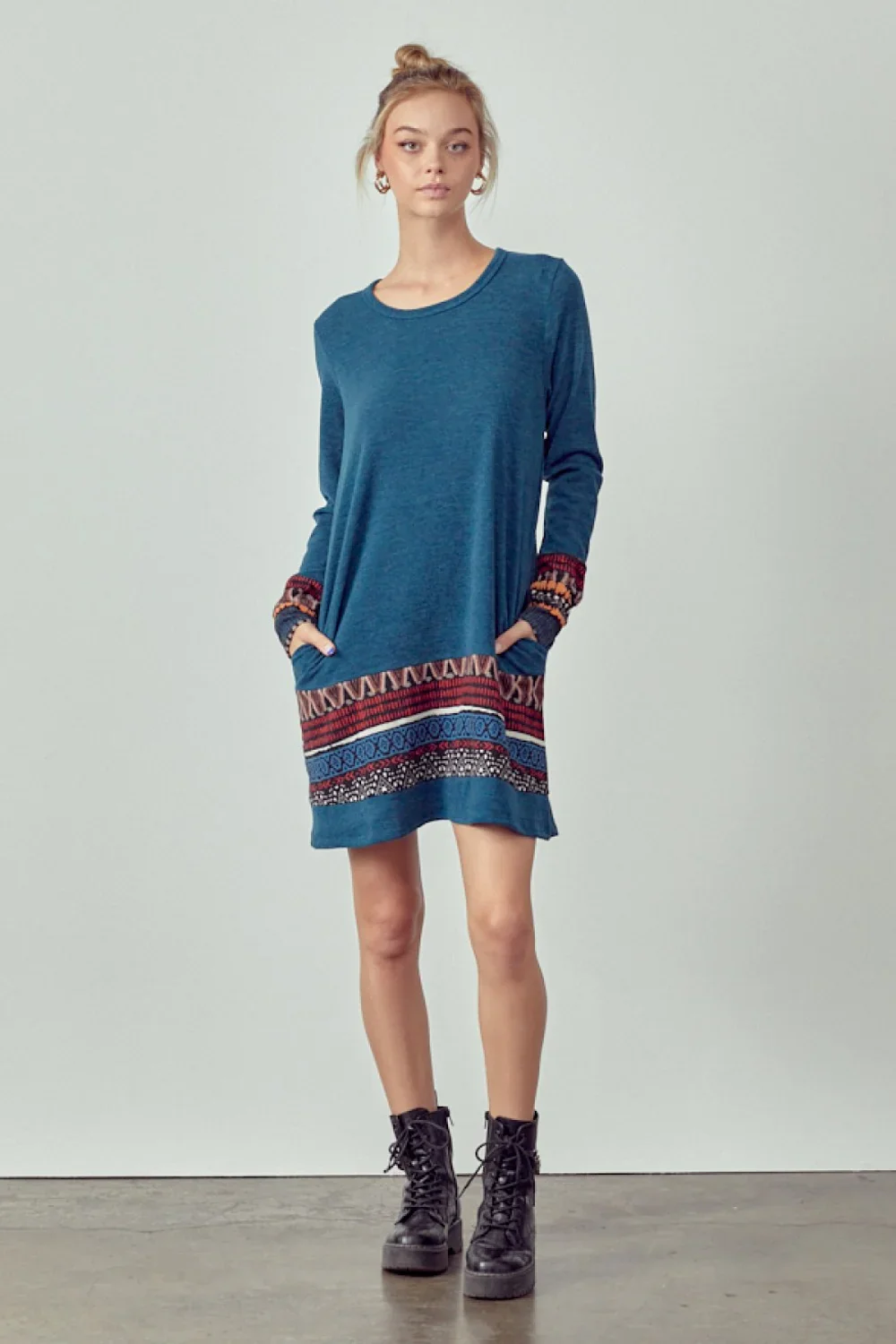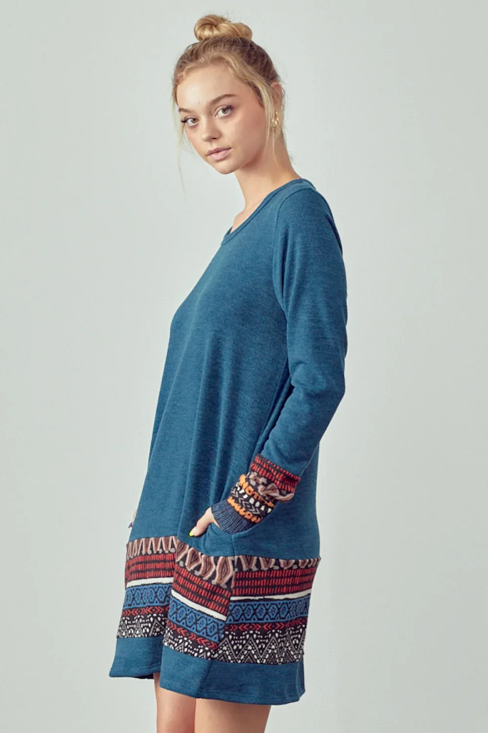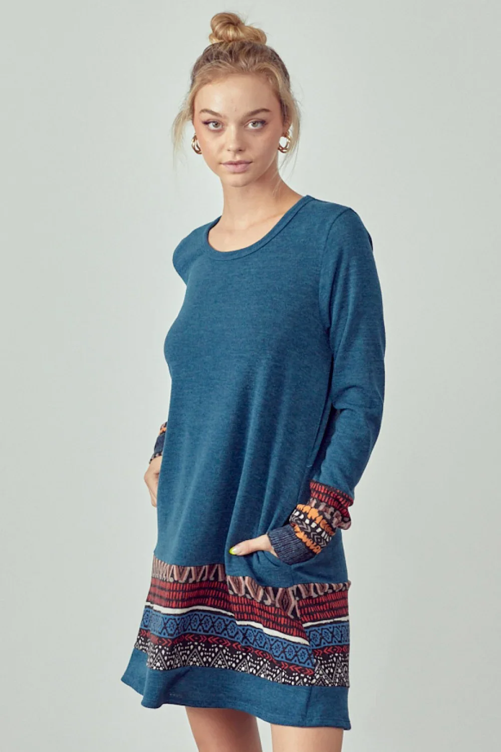 Plus Size Long Sleeve Ethnic Print Trim Casual Boho Shift Fall Winter Boutique Dress