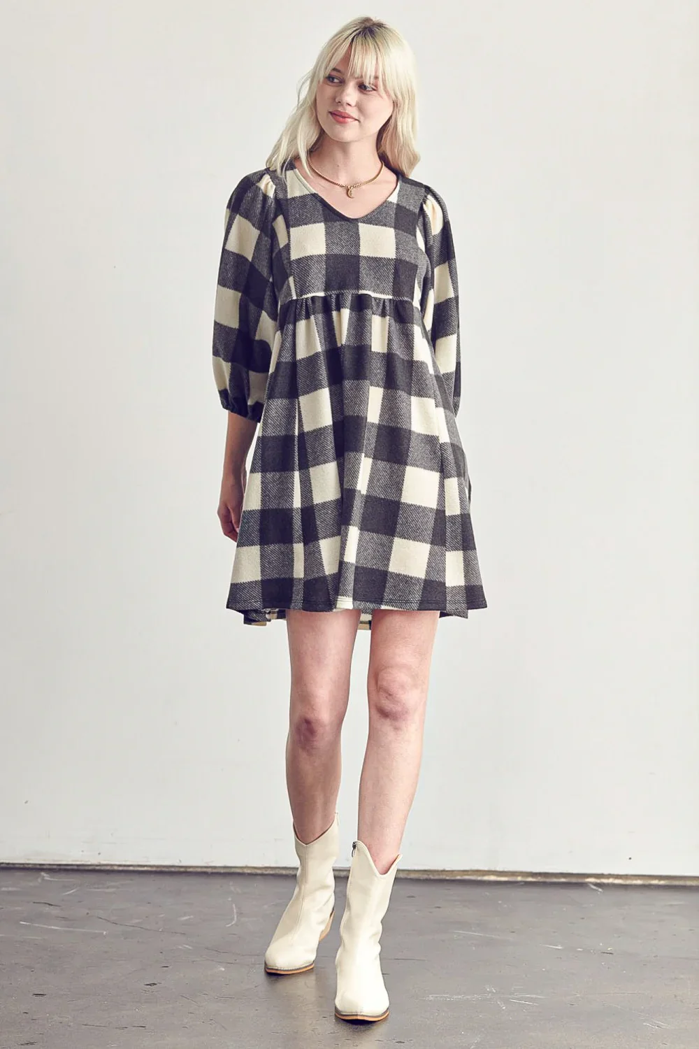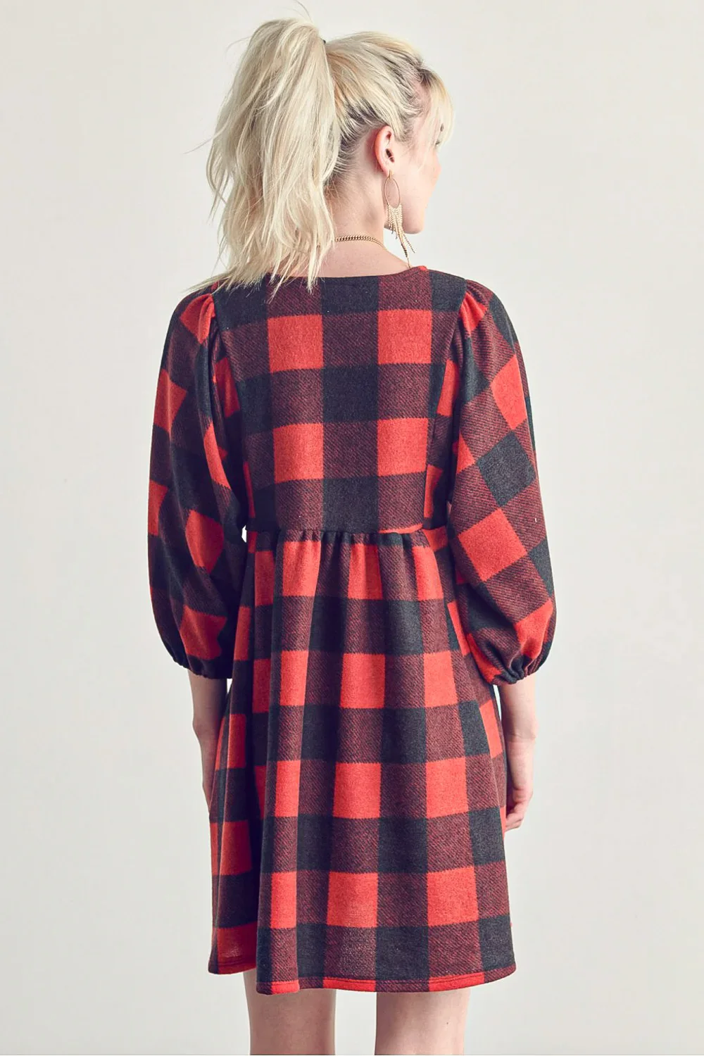 Plus Size Fleece Buffalo Plaid V Neck Puff Sleeve Cozy Casual Fall Winter Swing Dress